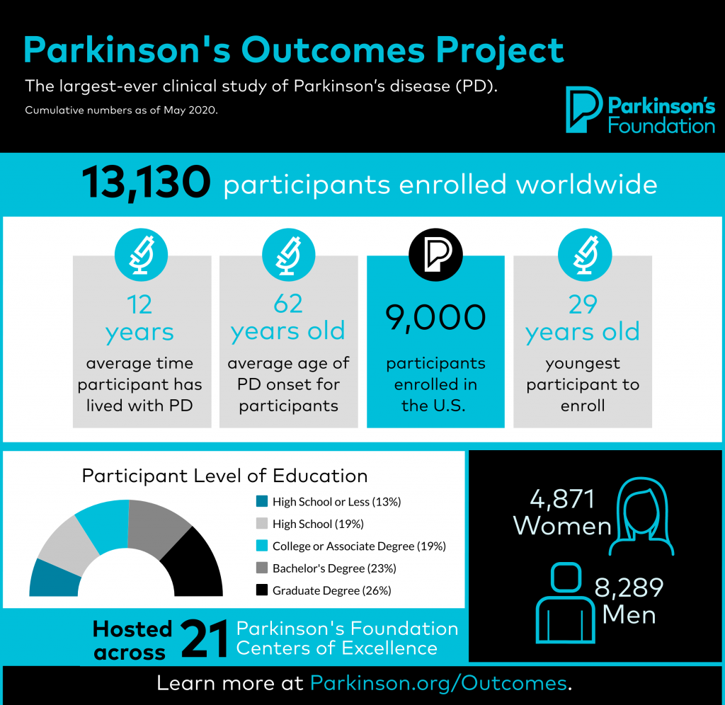 Started in 2009, the Parkinson’s Outcomes Project was one of the largest-ever clinical studies of Parkinson’s disease with more than 13,000 participants in five countries. Through this groundbreaking initiative, Parkinson’s Foundation Centers of Excellence tracked and monitored the care of people with Parkinson’s over time.
