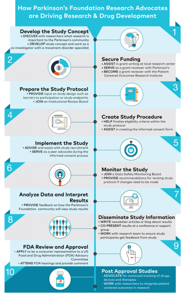 If you are interested in becoming a research advocate or working with research advocates, please email Karlin Schroeder at KSchroeder@Parkinson.org.