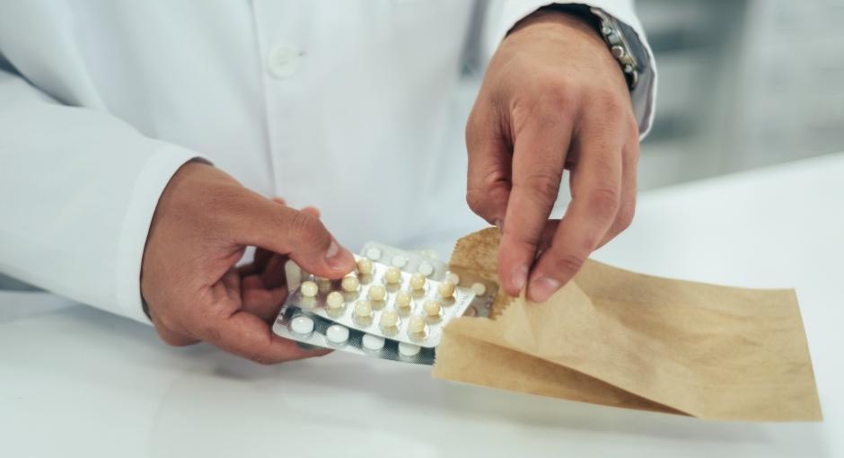Closeup shot of pharmacists putting medicine in a bag